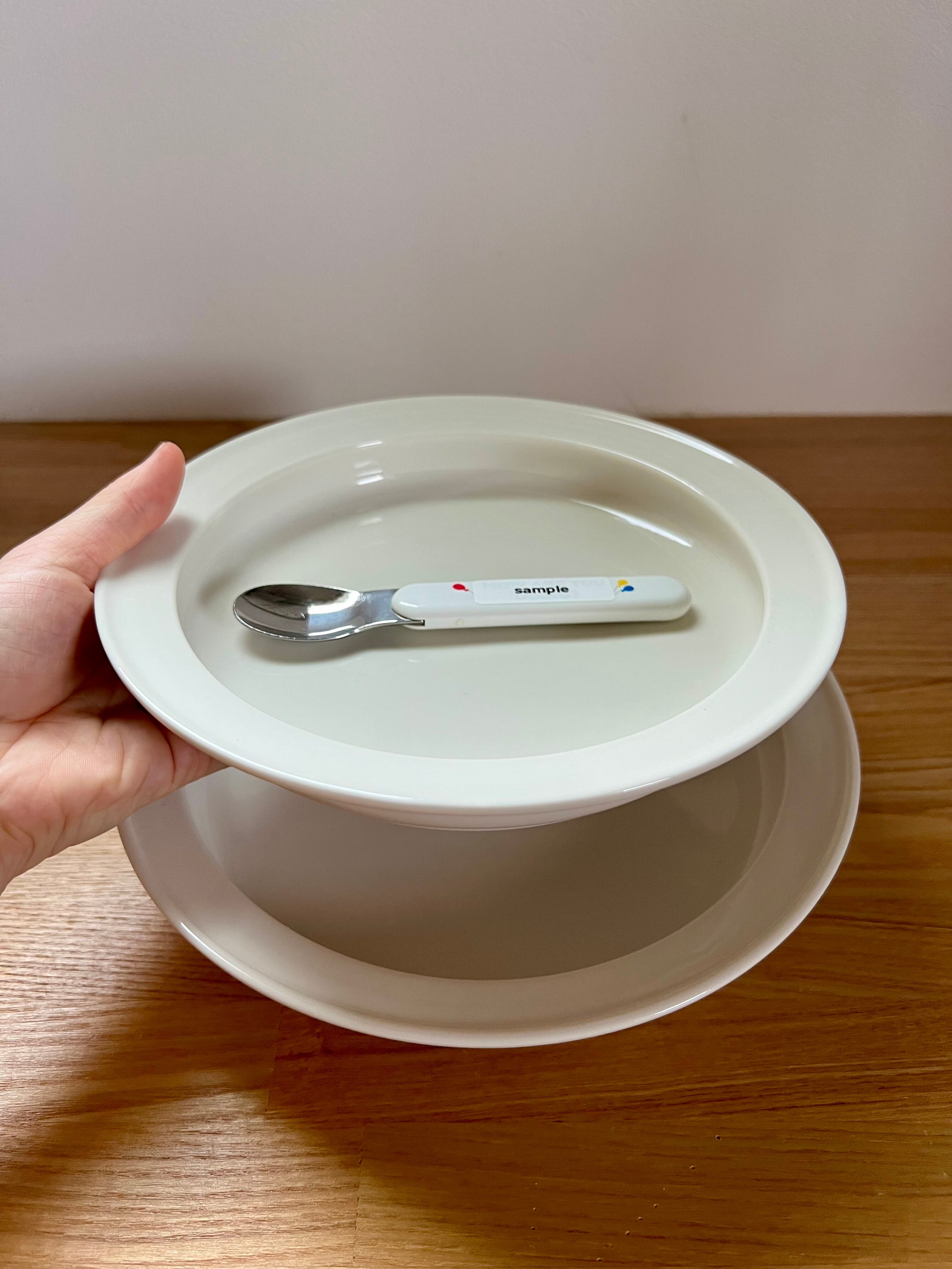 乳幼児がスプーンを使ってこぼさず、食べやすいようにとデザインされ、2002年のグッドデザイン賞にも選ばれた、森正洋さんデザインのユニバーサルプレート。