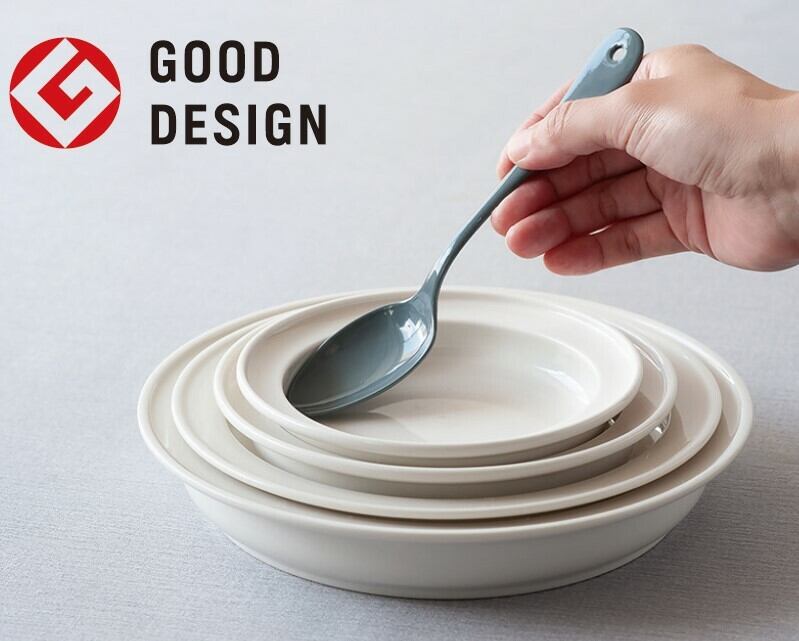乳幼児がスプーンを使ってこぼさず、食べやすいようにとデザインされ、2002年のグッドデザイン賞にも選ばれた、森正洋さんデザインのユニバーサルプレート。