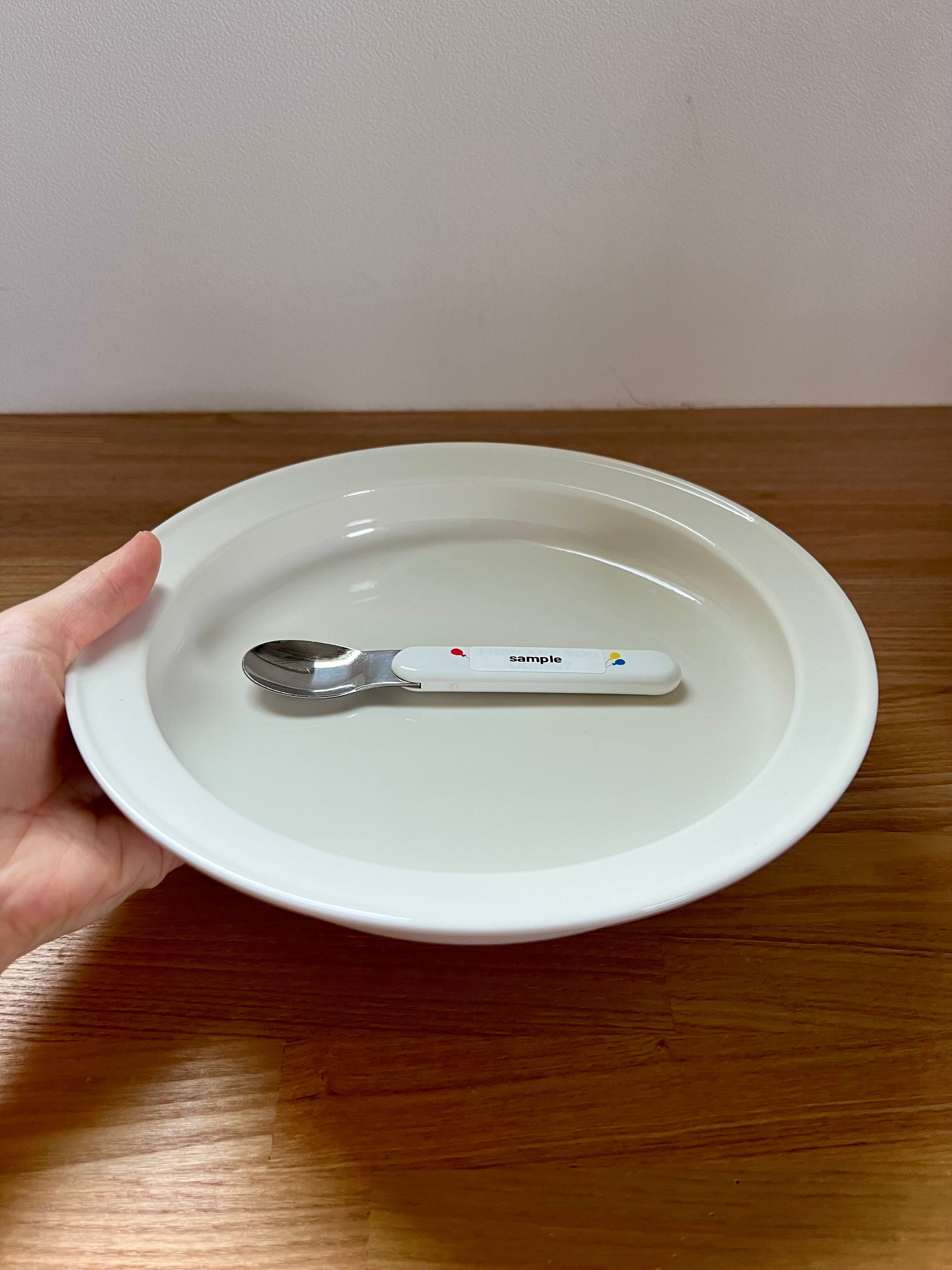 スプーンを使った時でもきれいにすくい切ることができるように、食器の内側が軽く湾曲しています。プレートに手を添えやすいようふちに幅があり、親指をのせて持ちやすく、安定した姿勢で食事ができるのも特徴。乳幼児が自分で食べるのはもちろんのこと、離乳食の時期にお母さんが子どもをヒザにかかえながら片手でスプーンを使うシチュエーションでも食べやすい工夫がなされています。