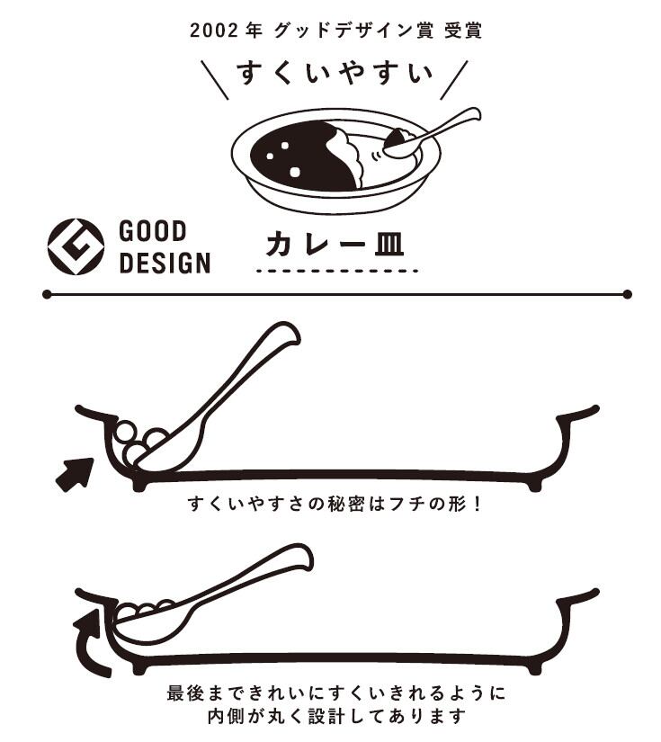 プレートに深さがあり、フチに丸みがあるのでこぼさずにすくえるのがポイントです。