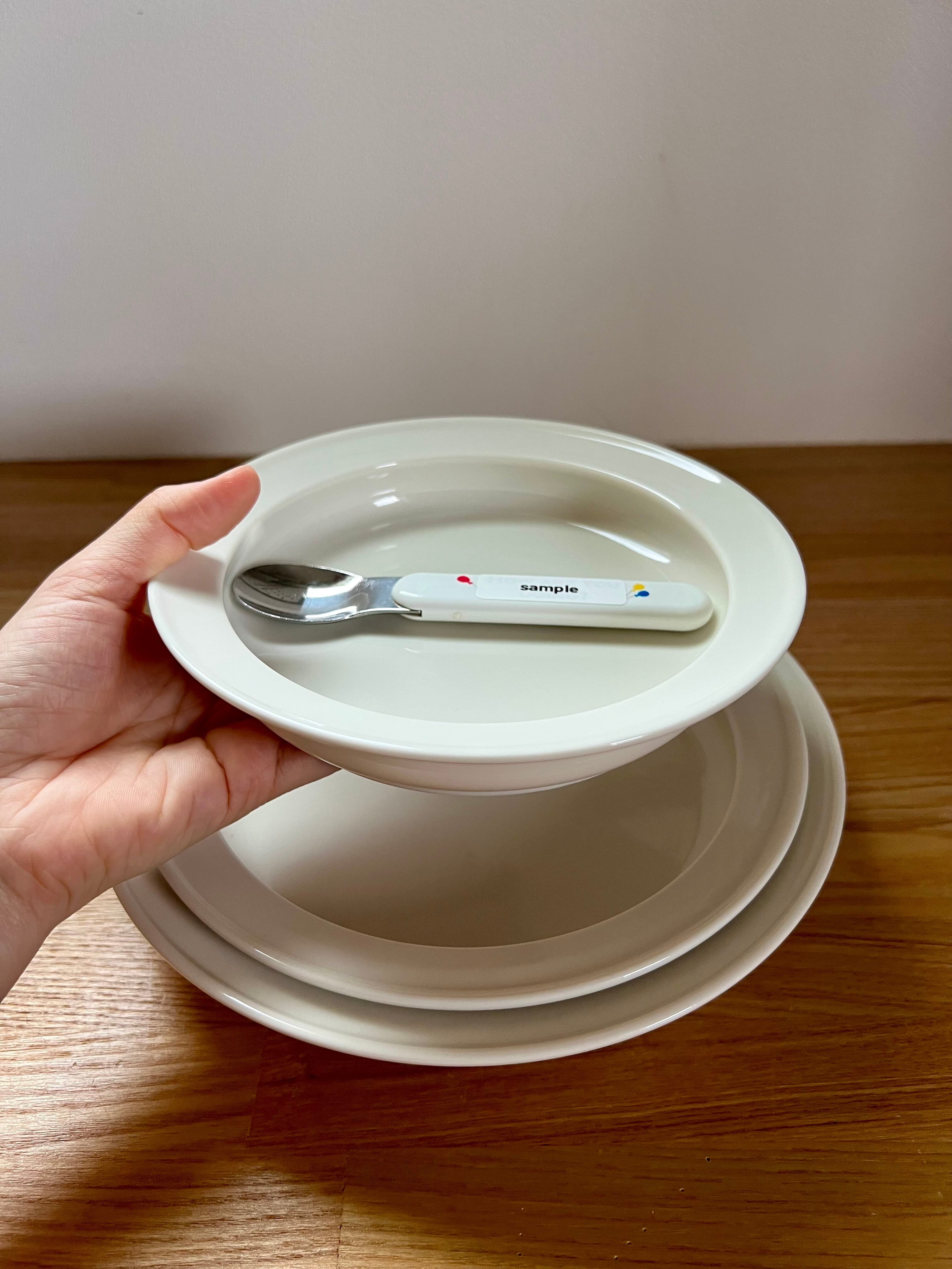 スプーンを使った時でもきれいにすくい切ることができるように、食器の内側が軽く湾曲しています。プレートに手を添えやすいようふちに幅があり、親指をのせて持ちやすく、安定した姿勢で食事ができるのも特徴。乳幼児が自分で食べるのはもちろんのこと、離乳食の時期にお母さんが子どもをヒザにかかえながら片手でスプーンを使うシチュエーションでも食べやすい工夫がなされています。