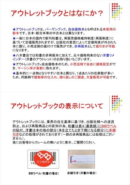 ※再販本(定価販売されている商品)と区別するため、裏表紙にBBシールの貼付がございます。本の地や、バーコードに赤線引きなどの処理がされている場合もございます。