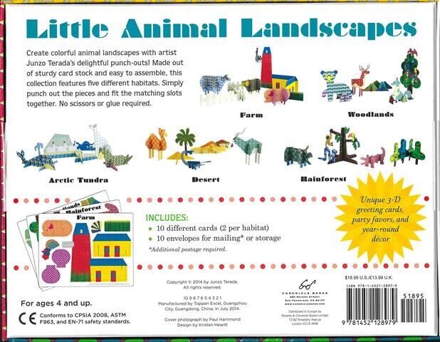 寺田順三氏のカラフルなパターンを特徴とするこの10枚のパンチアウトカードセットには、北極ツンドラ、砂漠、農場、熱帯雨林、森林の5つの異なる動物の生息地が含まれています。生息地ごとに2枚のカードを使用して、2つのミニチュア風景または1つの大きなディスプレイを作成できます。
