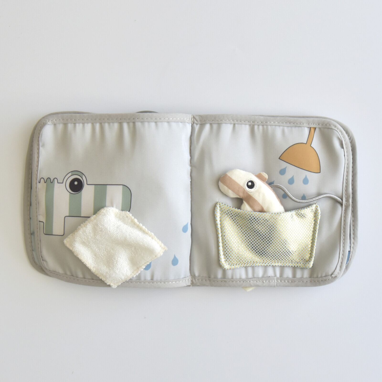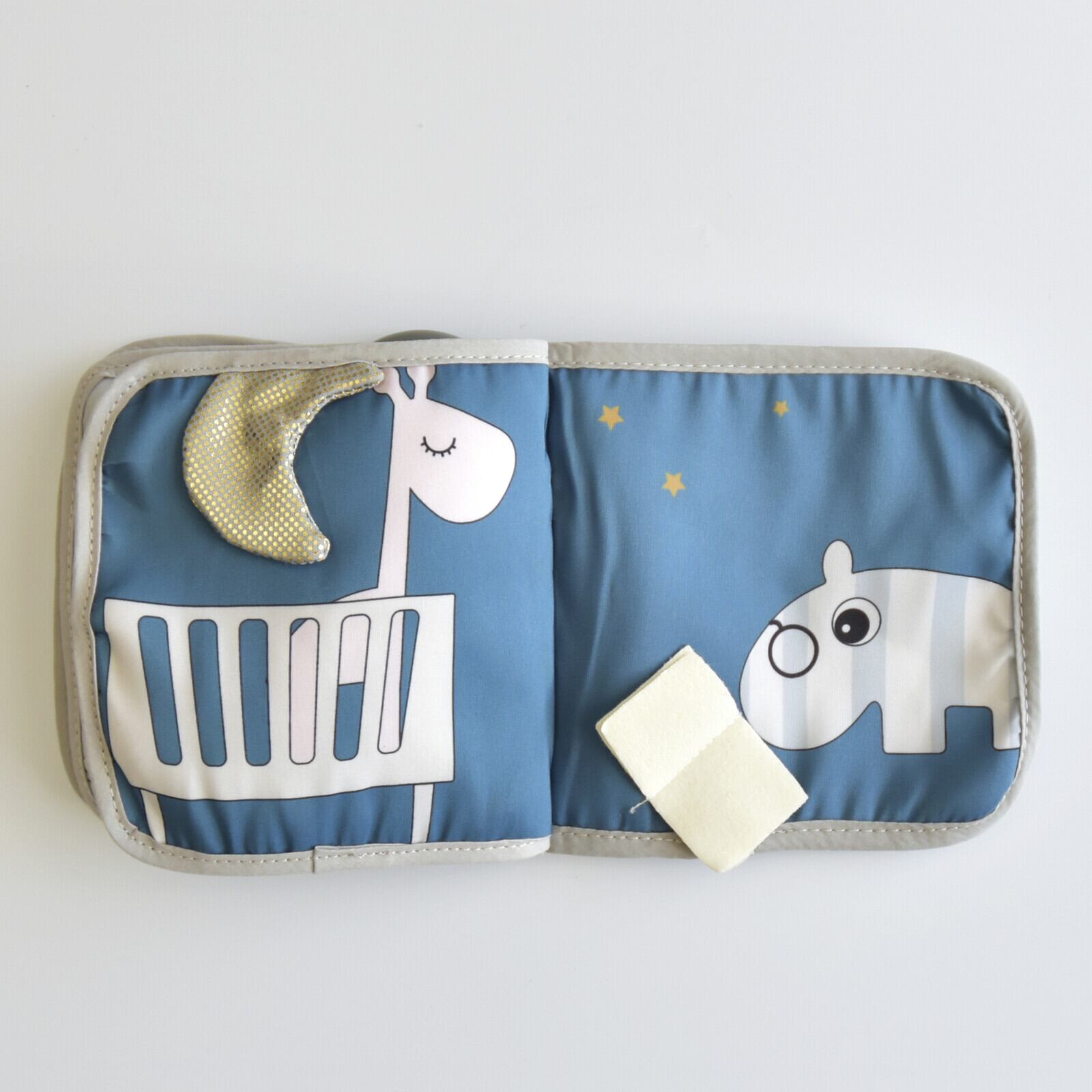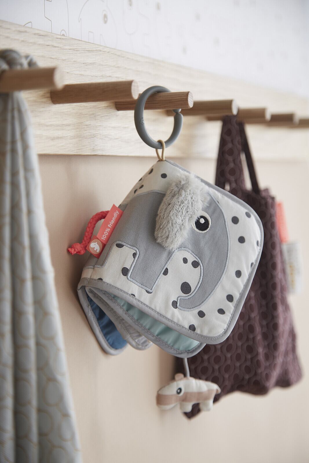 赤ちゃんの興味をそそる仕掛けが隠れたElpheeのアクティビティブック。本を開くと、鏡や歯固め、音の出るパーツなどが次々と現れて赤ちゃんの好奇心を刺激します。さまざまな素材が使われているから各所の手触りの違いも感じることのできる、見て触って聞いて楽しい布製絵本です。お出かけにも便利なリング付き。