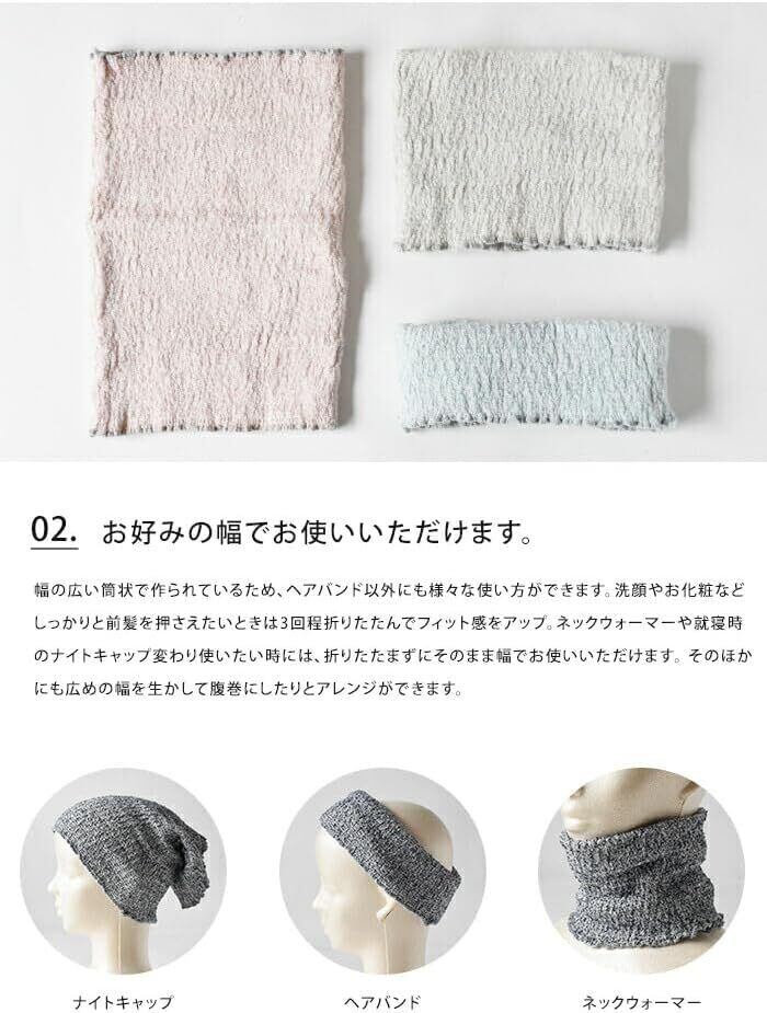 首につければネックウォーマーとして、お子さまにはキッズ腹巻として、広げて耳までカバーすればナイトキャップにも。