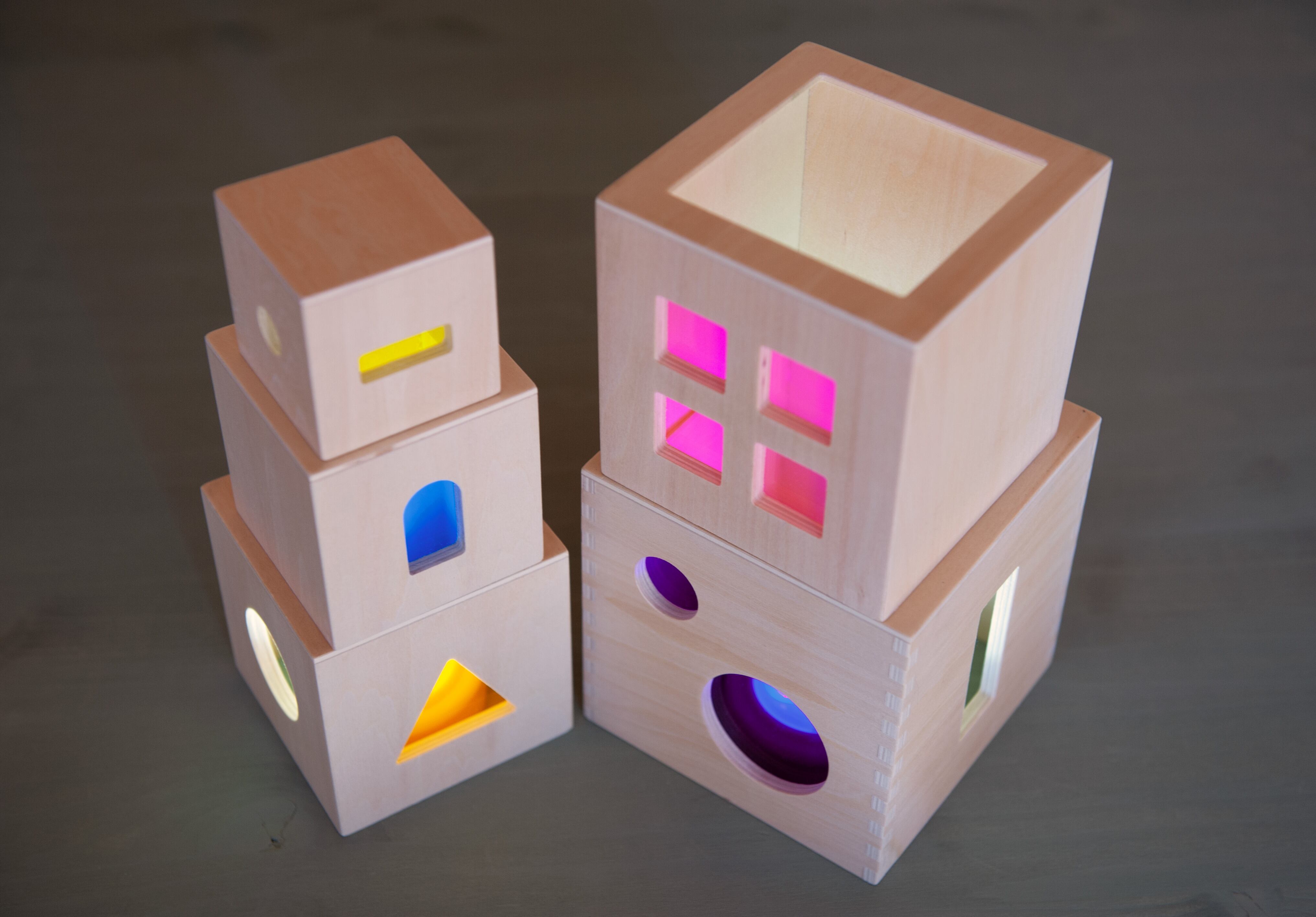 それぞれのピースに小窓の加工が施され、アクリル板が張られた美しいスタックボックスです。