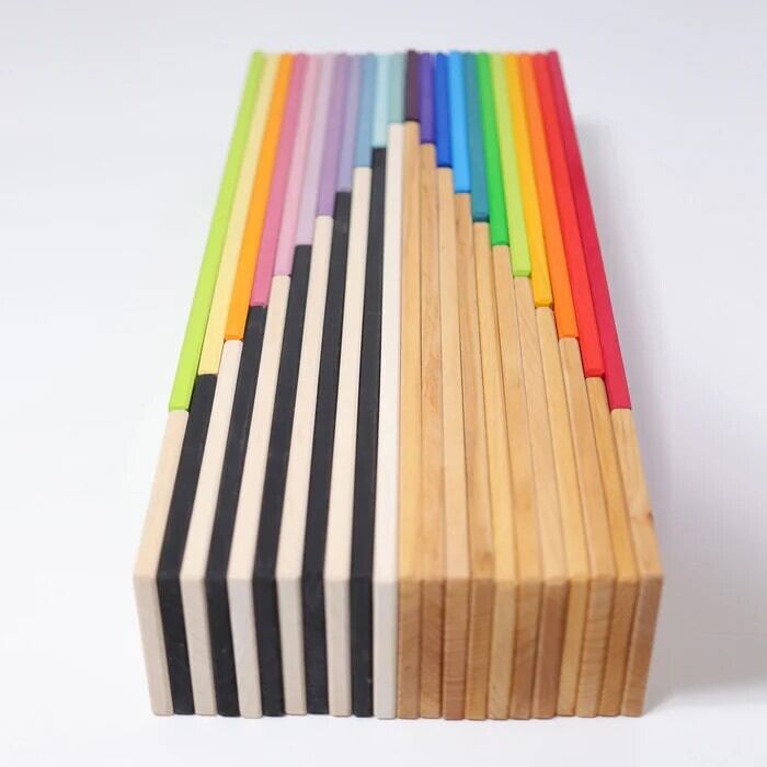 グリムス社は2006年8月、前身のSpiel und Holz Design社(所在地:エンクスティンゲン)より現オーナーへの交代を経てスタートしました。Spiel und Holz Design社の起源は1978年に遡ります。グリムス社は木を原料としたおもちゃをデザイン、製造し、世界各国に販売しています。木は、人が育て増やしていくことのできる資源です。そして木は、ザラザラ、なめらか…と表面の手触りも様々。そして手に取れば温かく、いい匂いもします。たたいた時の音さえ、重く響いたり、軽やかに聞こえたりします。長く愛されることを願い、「色彩のもたらす喜び」をお届けするため、こどもの玩具にふさわしい原料を使用しています。子どもが自分の感覚を頼りに身の回りの物を把握していく過程を、様々な側面からサポートし、豊かな五感の発達を促します。グリムス社が大切にしていることは、シンプルなデザインと調和の取れた色彩、フォルムからの一切の無駄を省き、使い手が遊びの中で自分の創造性を思いのままに羽ばたかせることのできるおもちゃを作ることです。色彩は自然界の「虹」の色をお手本としているので、このおもちゃを手に取った人たちの心に様々な表情で語りかけ、色彩の喜びに溢れた世界へとお誘いします。