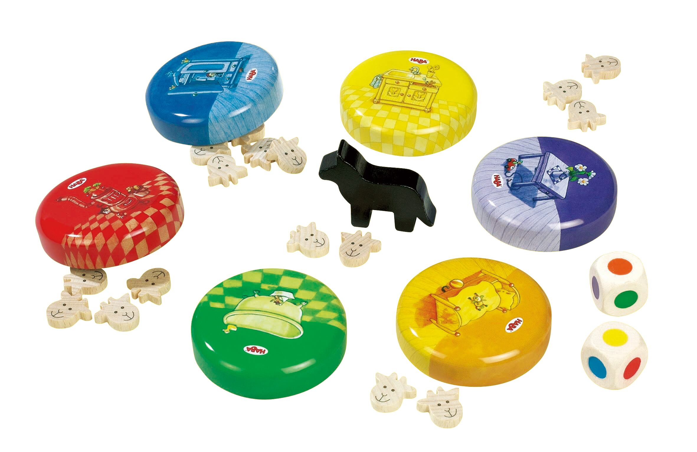 サイコロの示した場所の子やぎの数は変わります。何匹隠れているかを記憶して当てましょう。6箇所の隠れ場所に最初は5匹。サイコロを振り、出た色に何匹の子やぎが隠れているかを言い当ててから缶を開けます。