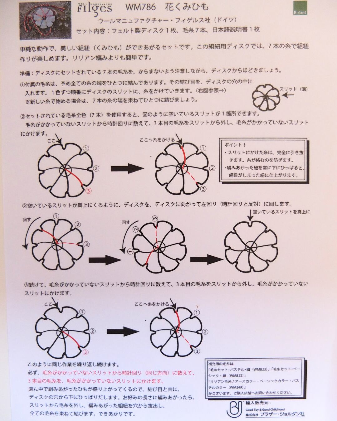 リリアンよりも簡単に、単純な工程で楽しく組紐がつくれるキットです。ピオランドの羊毛や美しい草木染の毛糸はさすがWM社です。