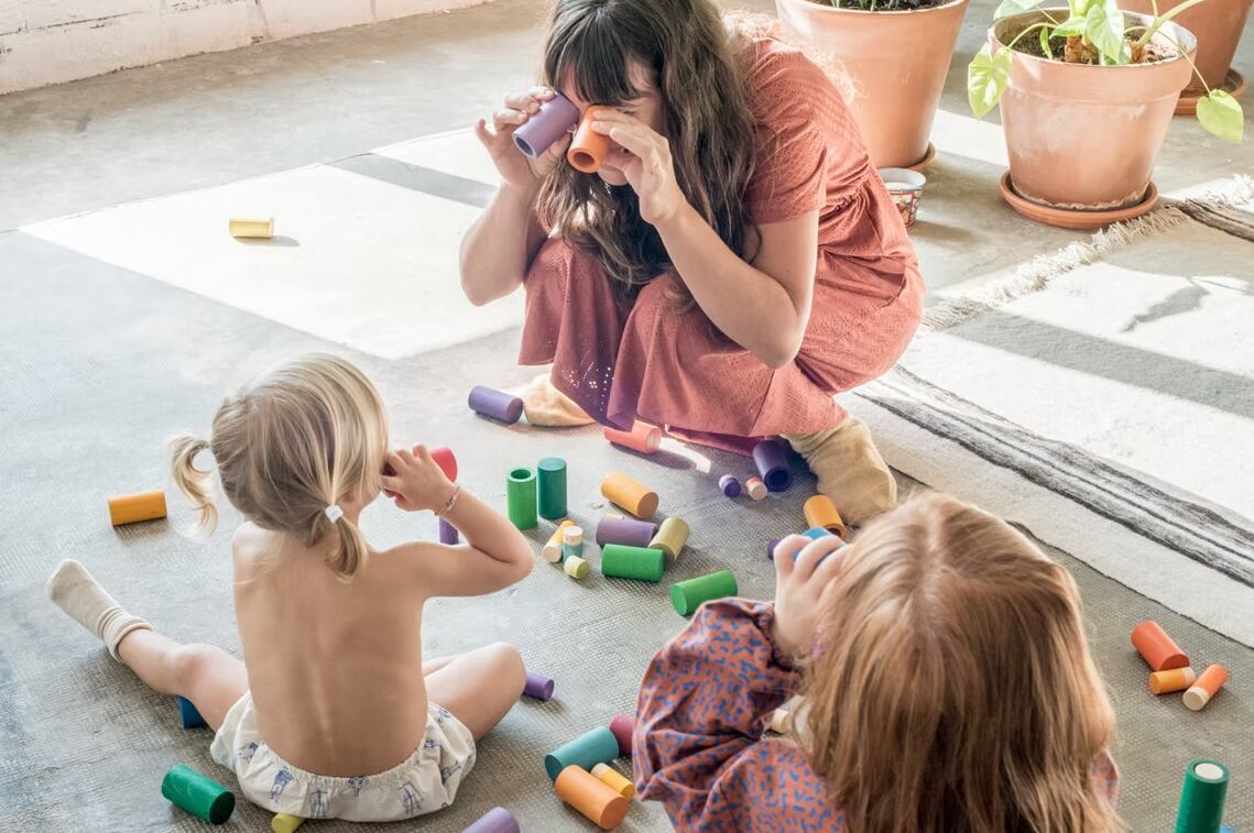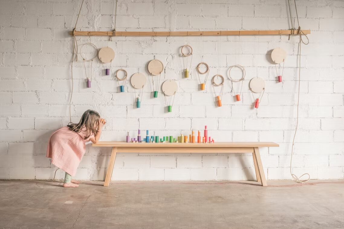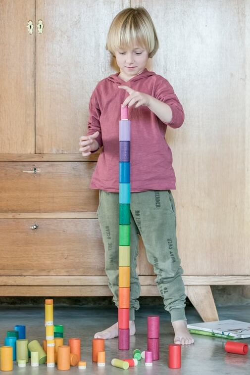 さまざまな種類のチューブは、覗いてみたり、架空の世界をつくったりしながら、目と手の動きの発達を促します。いくつかは木、建物、車などになったり…。また、それを構成する要素の色と形に従って要素の分類、グループ化と関連付けを通して論理数学的思考の発達を可能にします。