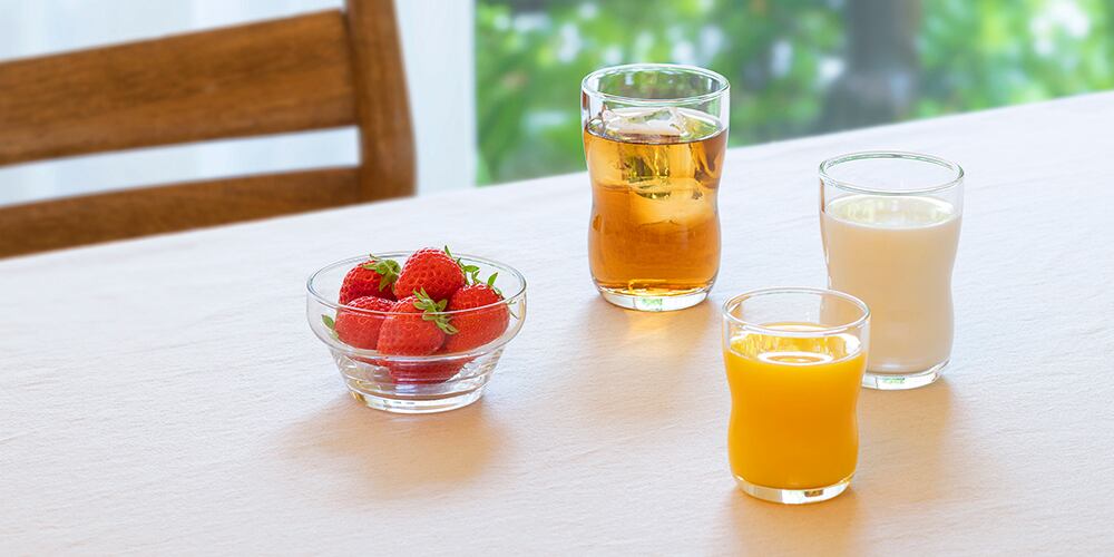 硝子食器は割れる、という理由で子供から遠ざけるのではなく、物を丁寧に扱う経験や天然素材であるガラスという「本物」に小さな頃から触れさせる事が大切。食育指導士でもある保育士さんの視点から子供用ガラス食器シリーズ「つよいこグラス」は生まれました。