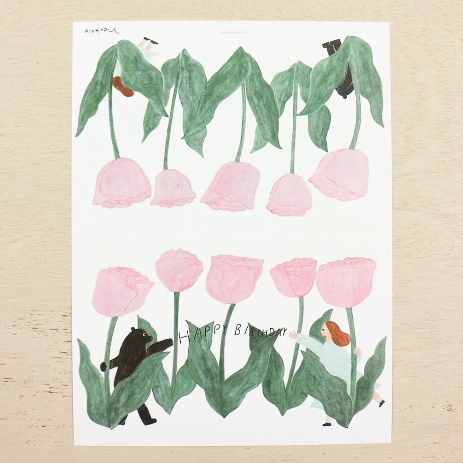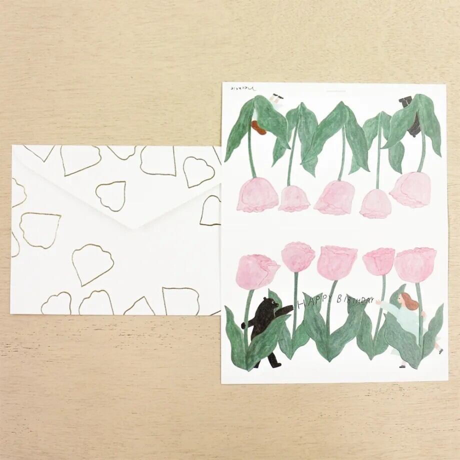 ほっこり心があたたまる、イラストレーターユニット・ネクタイによるデザインの二つ折りバースデーカード。カードにはぽこぽことしたエンボス加工(浮き出し加工)を施しました。くまさんと女の子が チューリップに囲まれてお祝いしてくれる、かわいいデザイン。