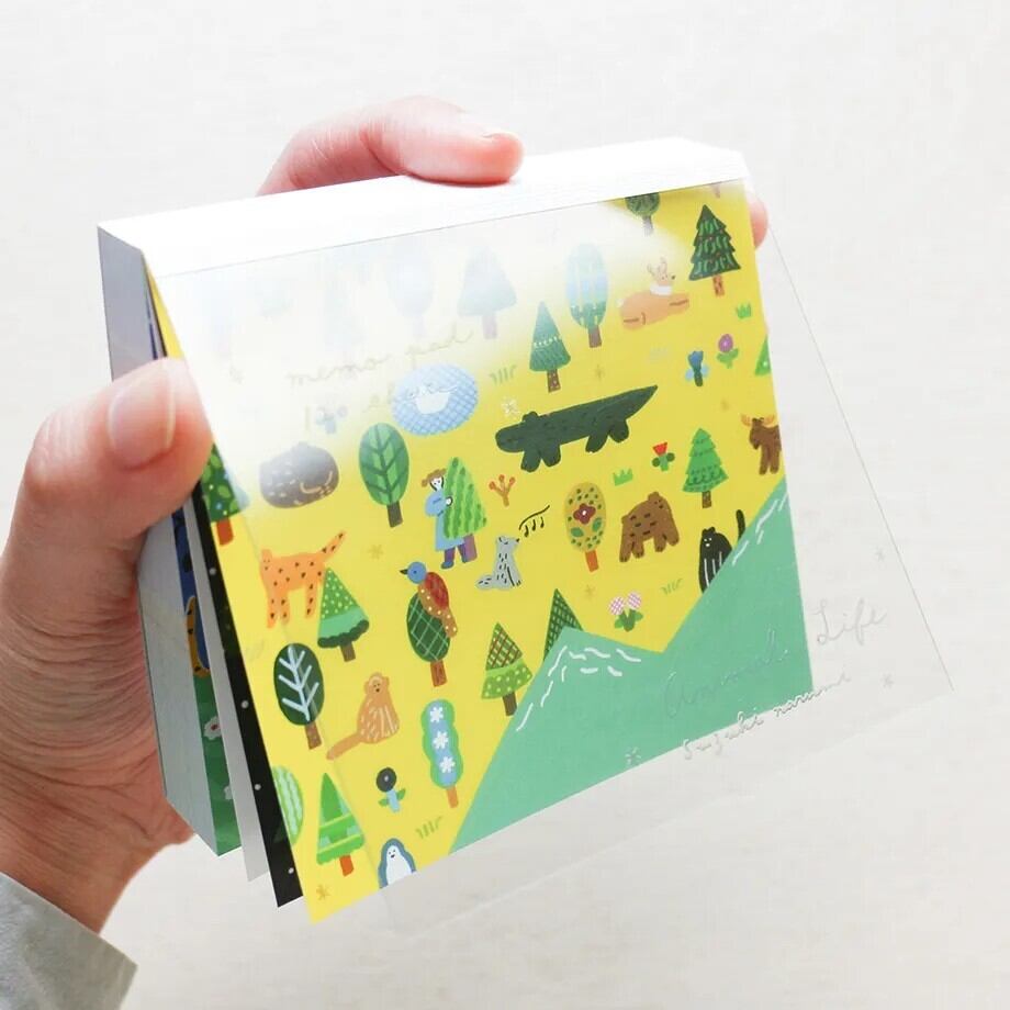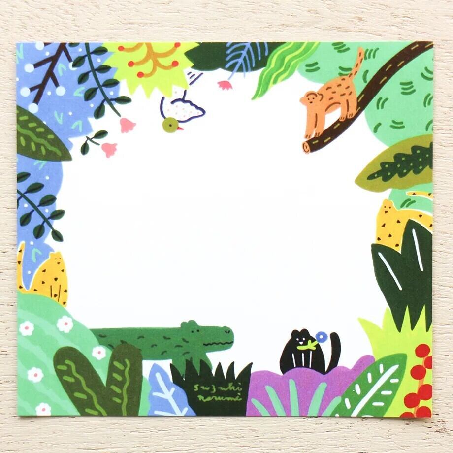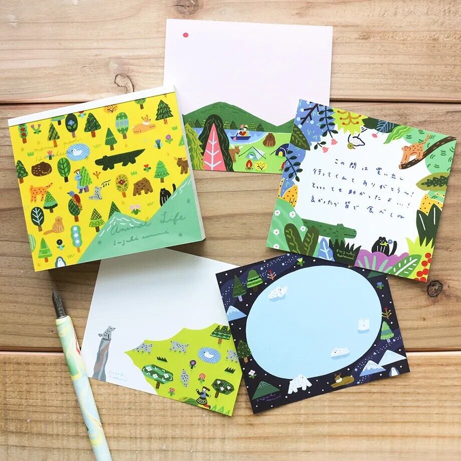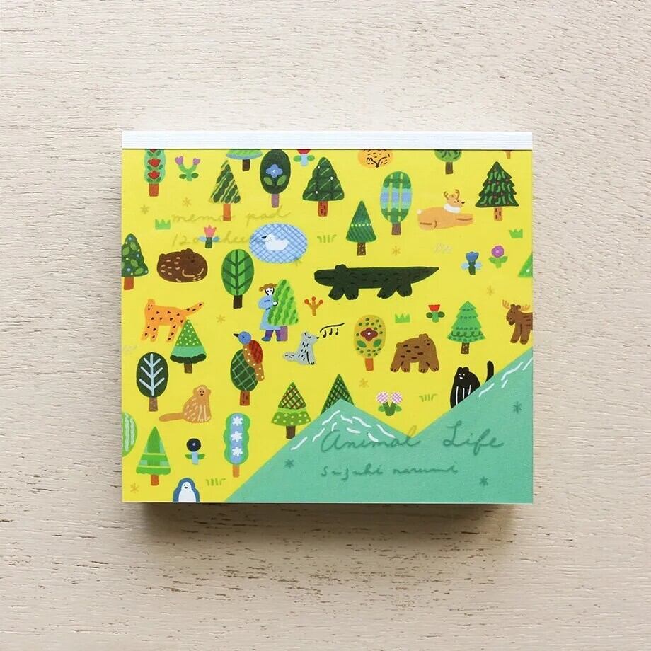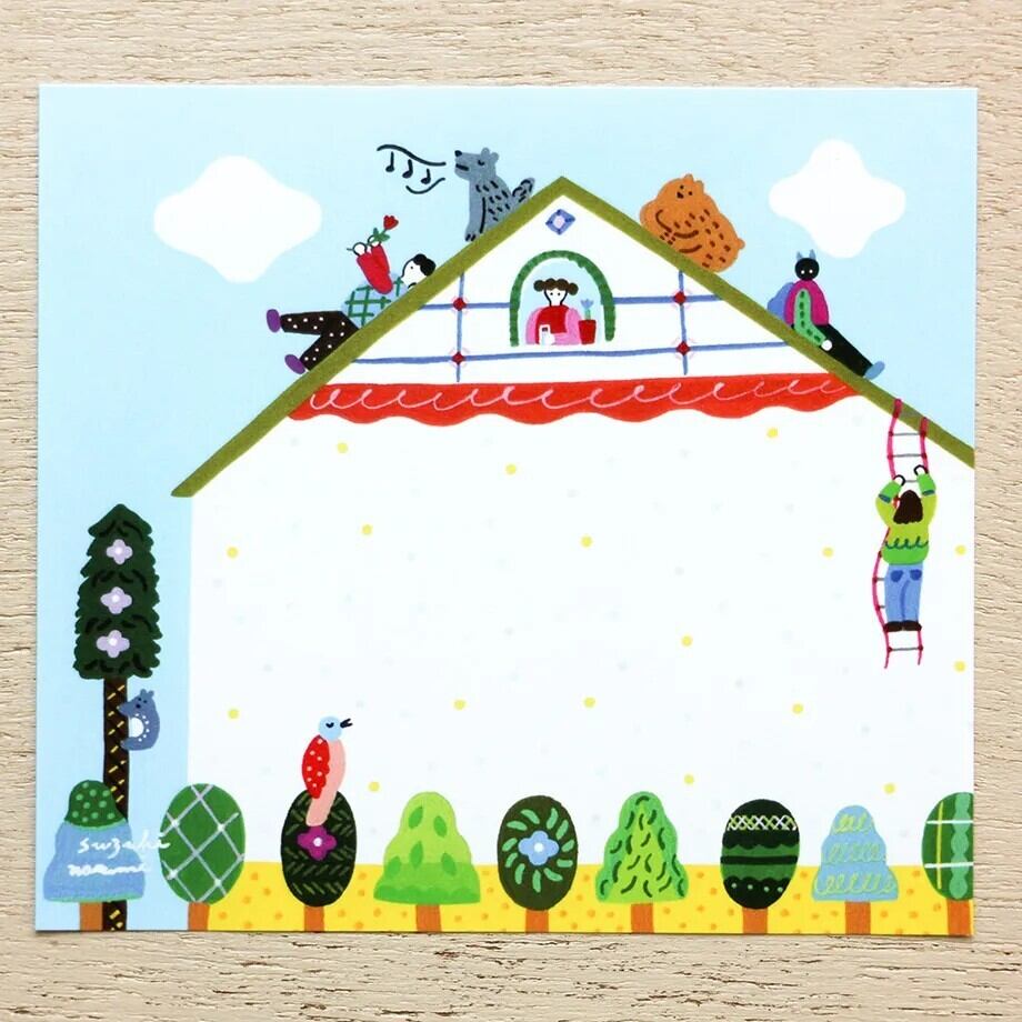 いろんな人や動物たちが楽しげに描かれた、鈴木なるみのかわいいブロックメモ。