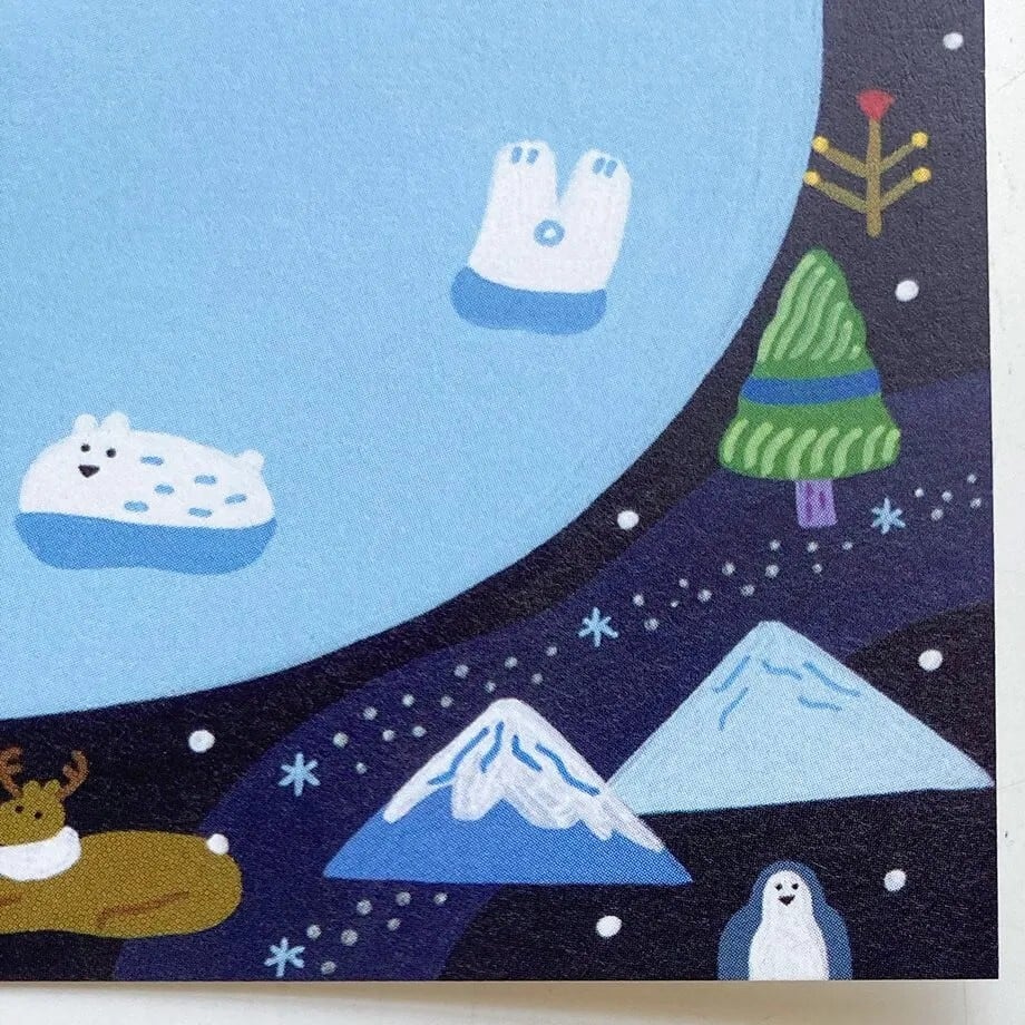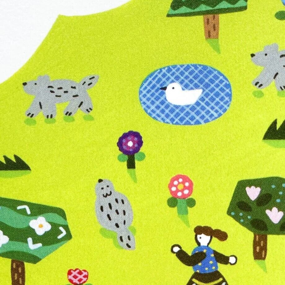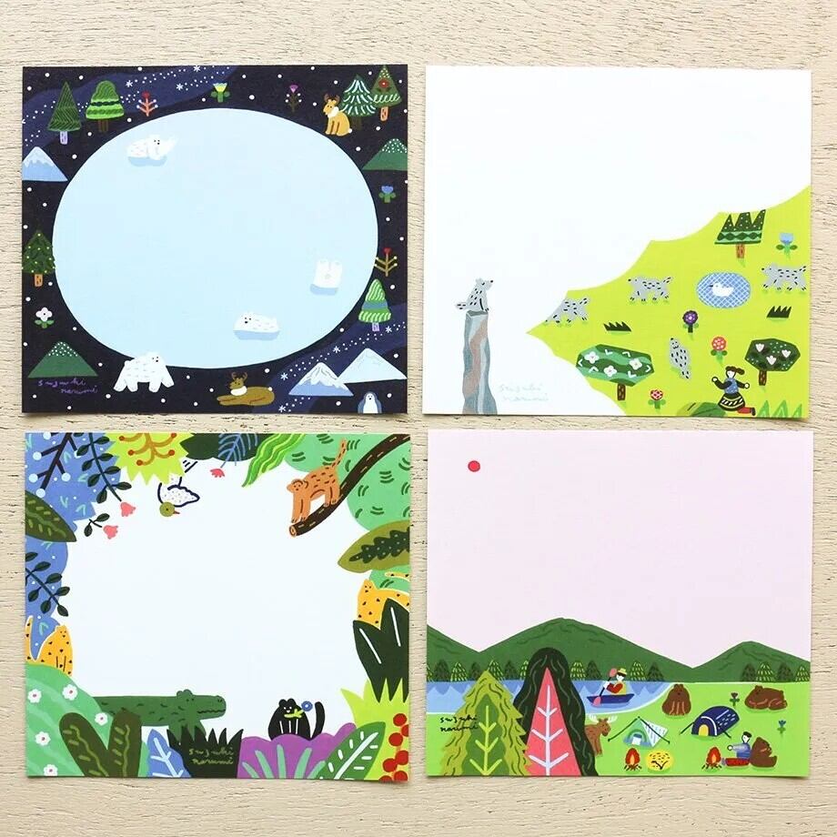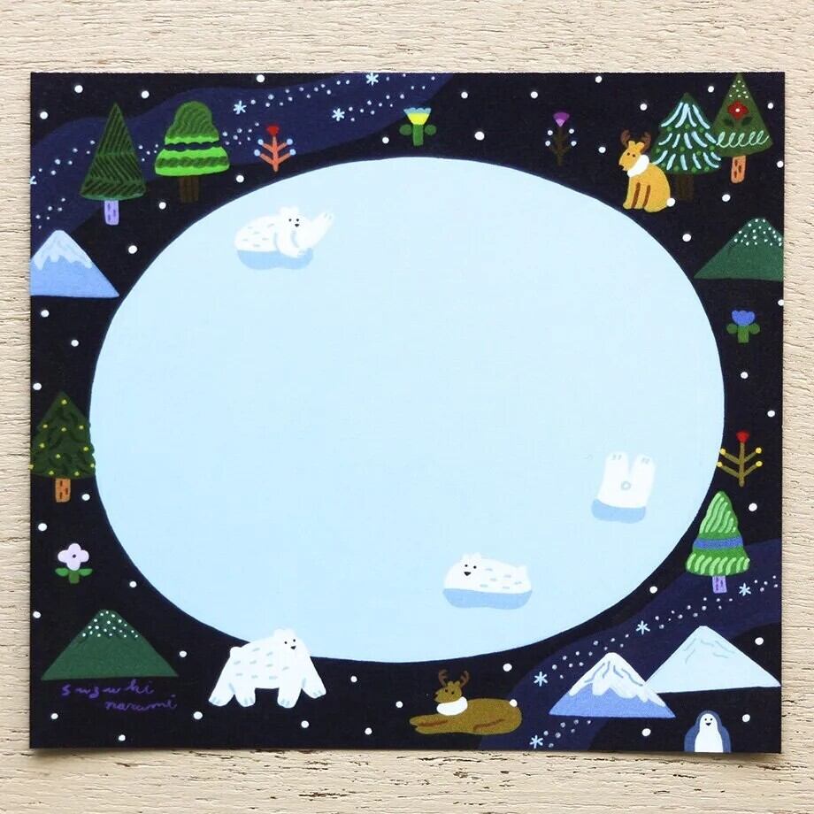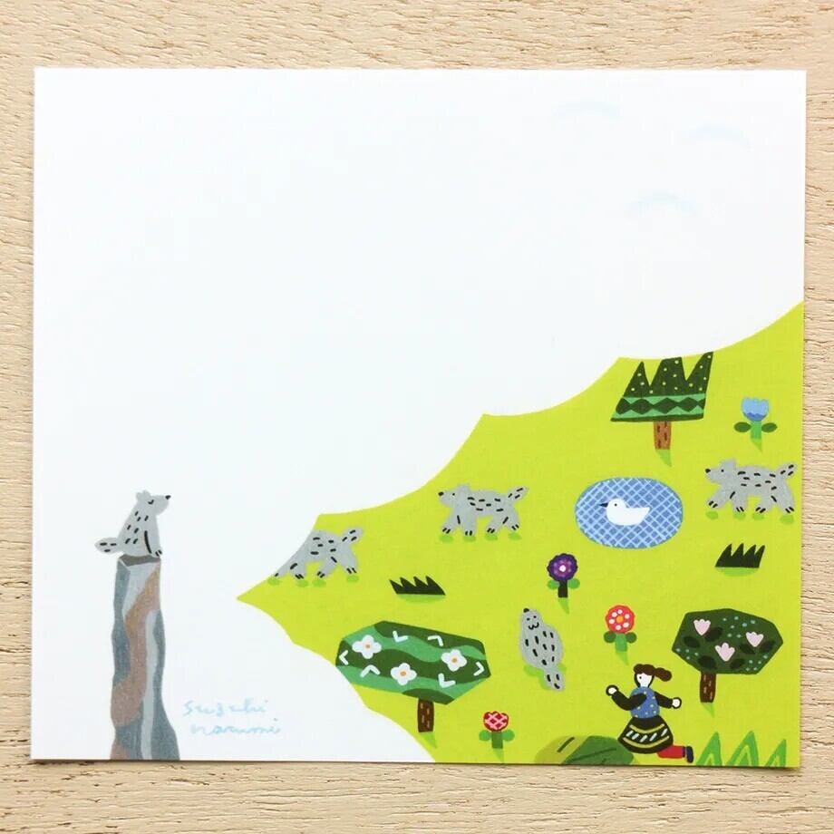 いろんな人や動物たちが楽しげに描かれた、鈴木なるみのかわいいブロックメモ。