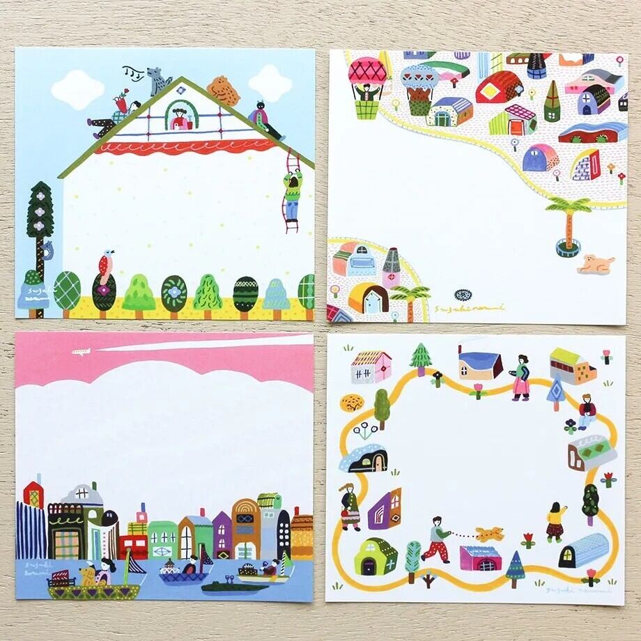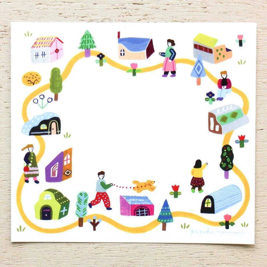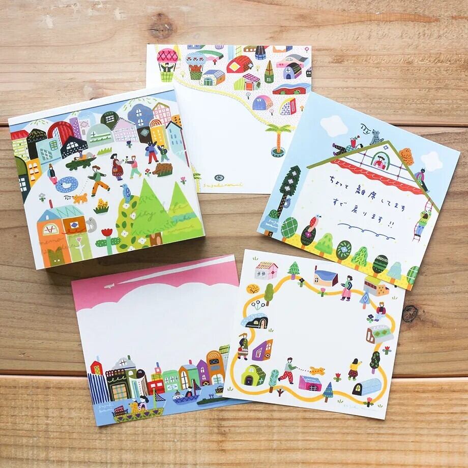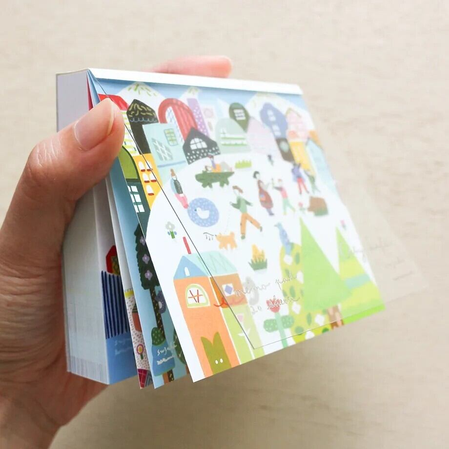楽しげな街並みがキュートに描かれた、鈴木なるみのかわいいブロックメモ。