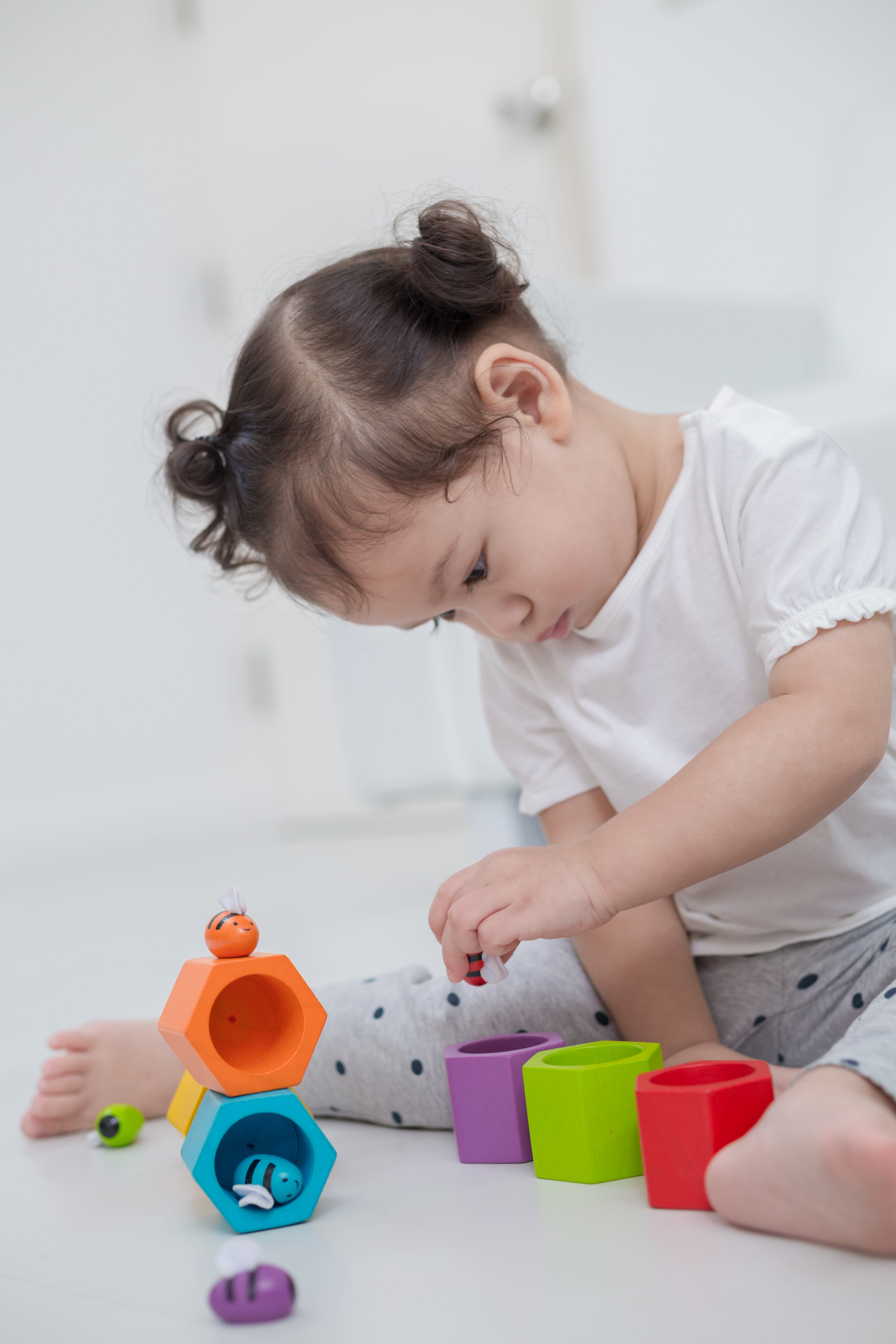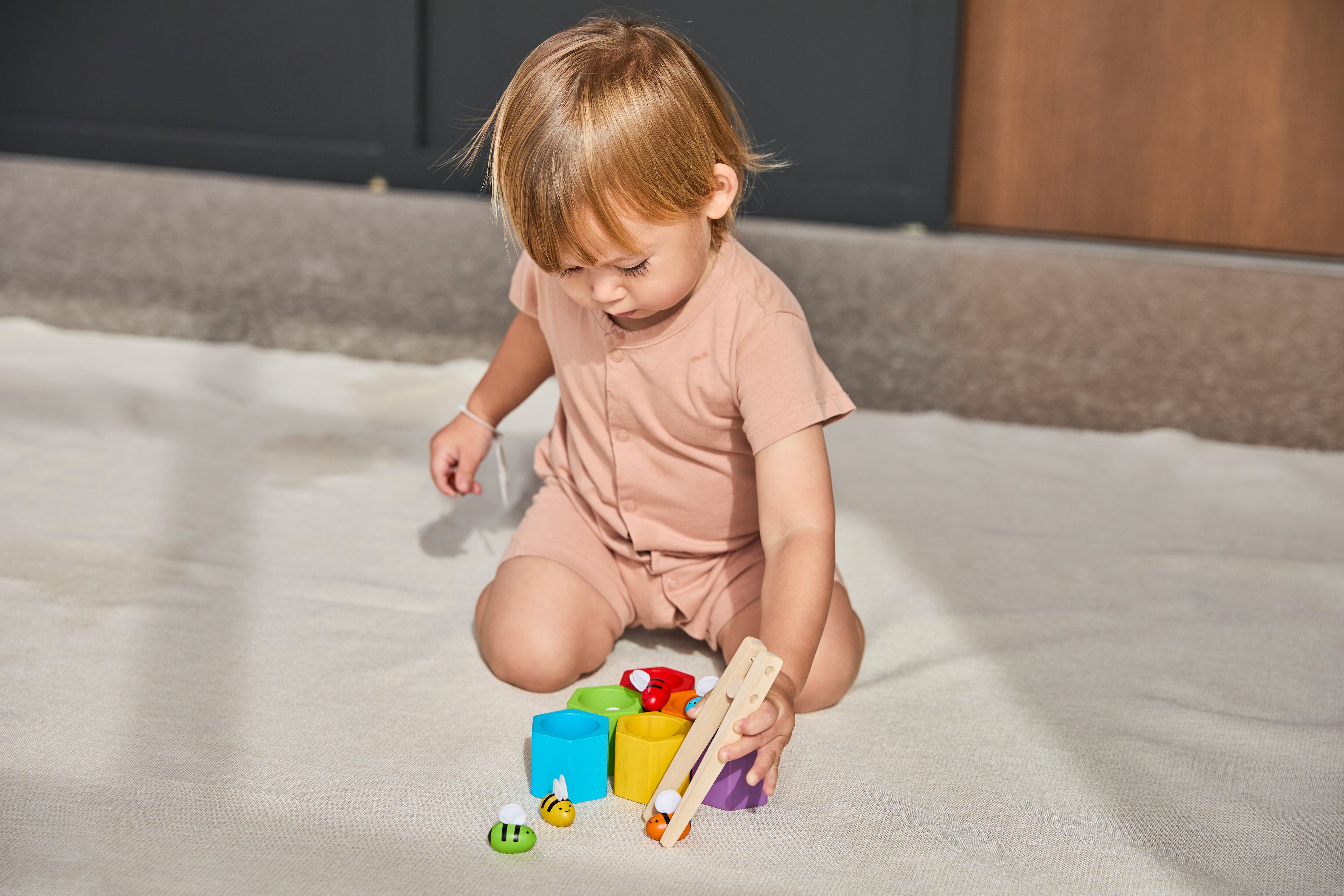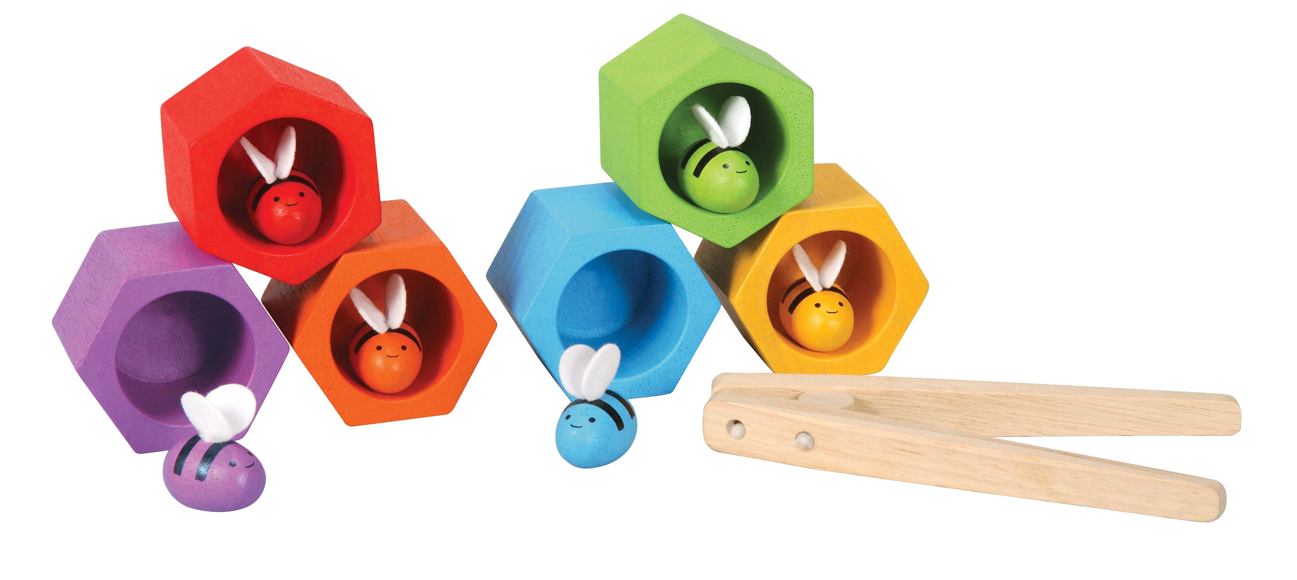 ハチさんを指や付属のピンセットでつまんで、ハチの色とあった巣に入れて遊びながら、微細運動神経を発達させることができます。色の認識や数勘定の学習にもなります。