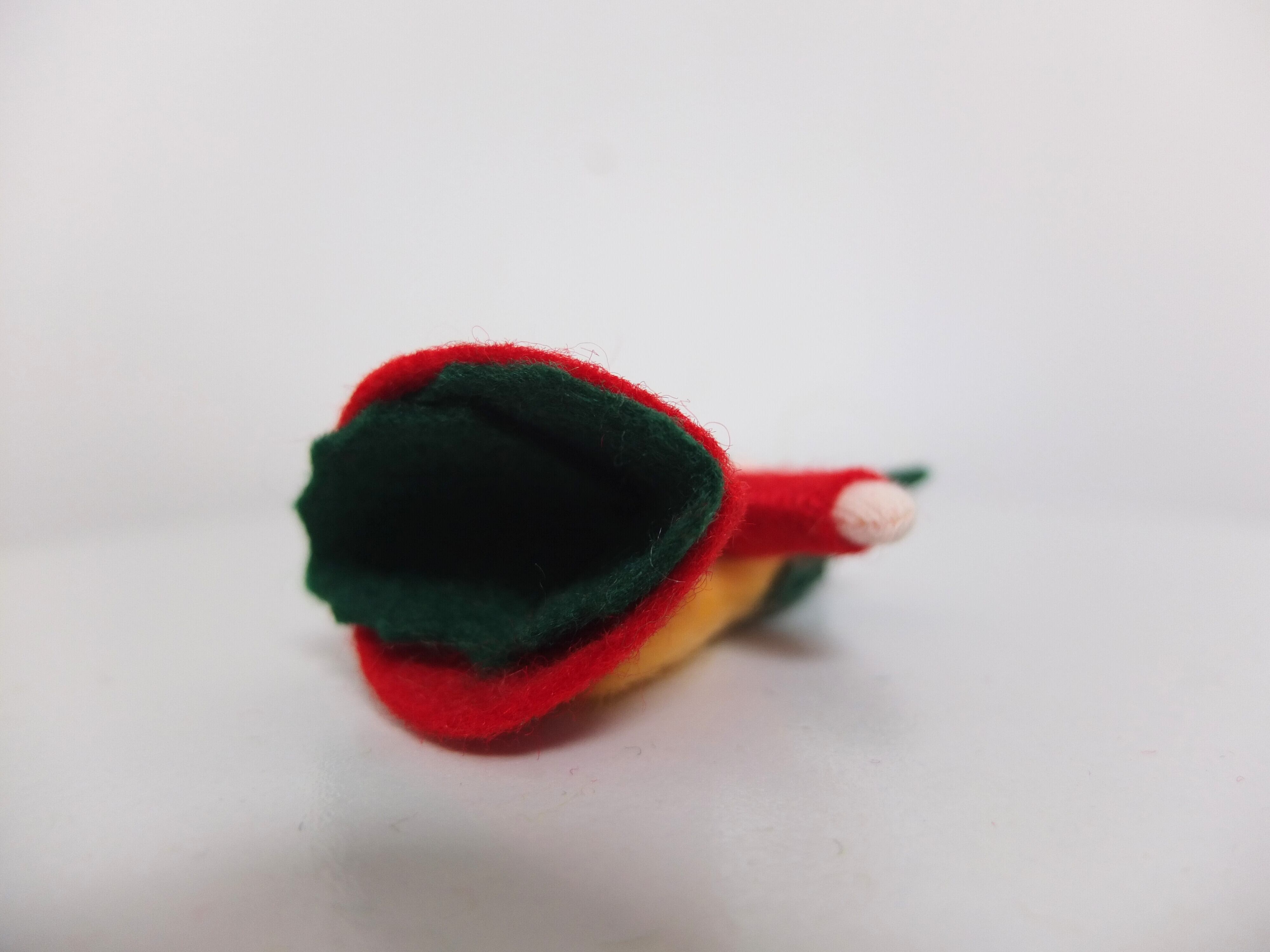 真っ赤なスカートから覗くヒイラギの棘のついた葉がキュートな女の子です。