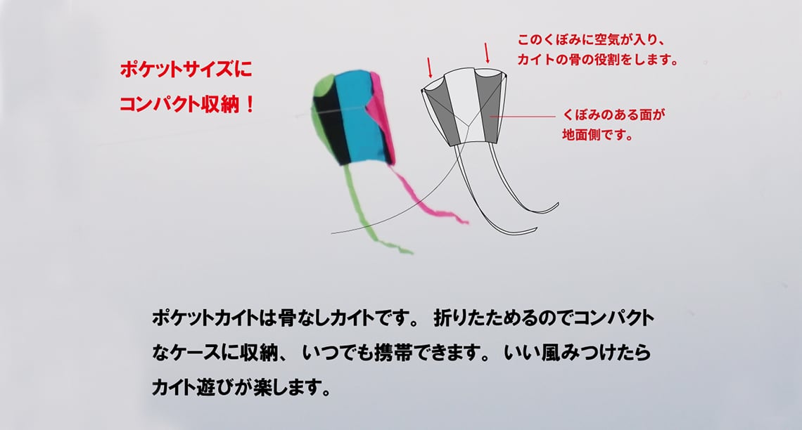 ポケットサイズに収納、風を感じる骨なしカイト。