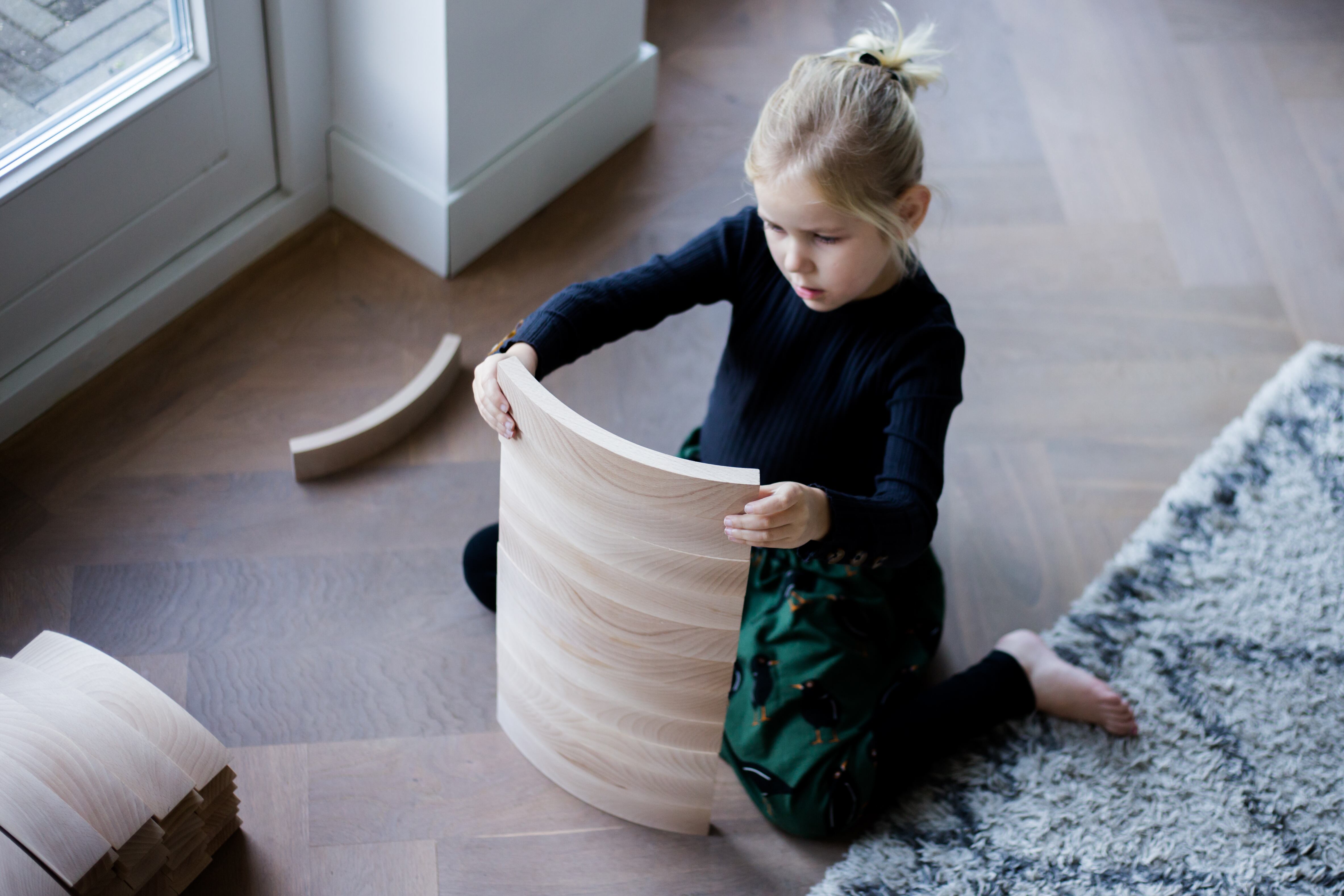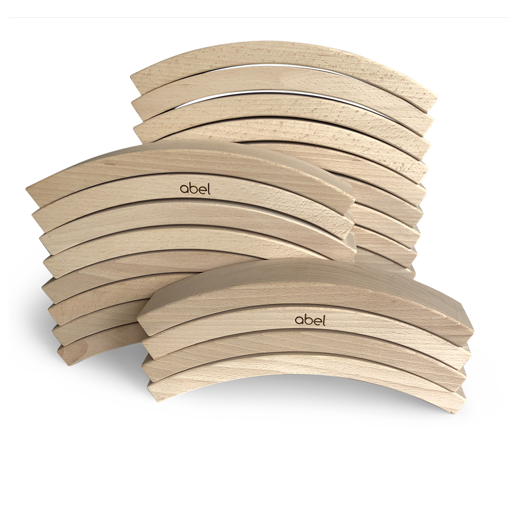 オランダのJelmer,Folko兄弟によってデザインされたabelブロックはFSCヨーロッパブナを素材として手作業で作られています。積み木は美しいカーブを描き、暖かみのある肌触り。自然な仕上がりは美しい木目を際立せます。