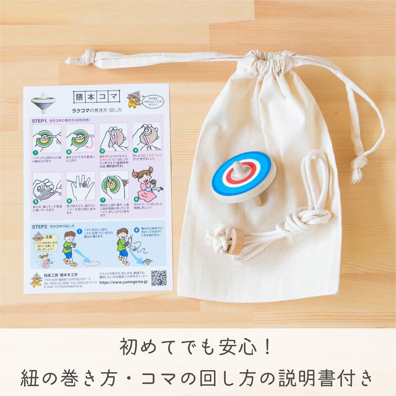 セット内容:ラクコマ ×1、こま紐 ×1、巾着袋 ×1、回し方説明書 ×1
