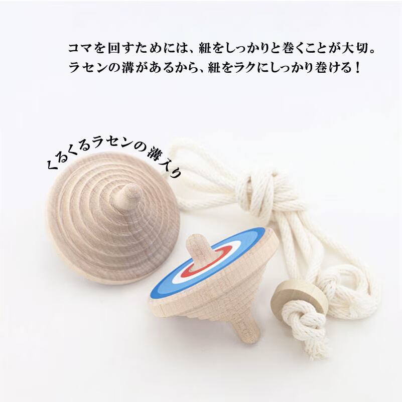 ラクコマは、コマ裏にらせんのミゾが入っているので、ミゾに沿って紐がキレイに巻けるので、紐が巻きやすい。