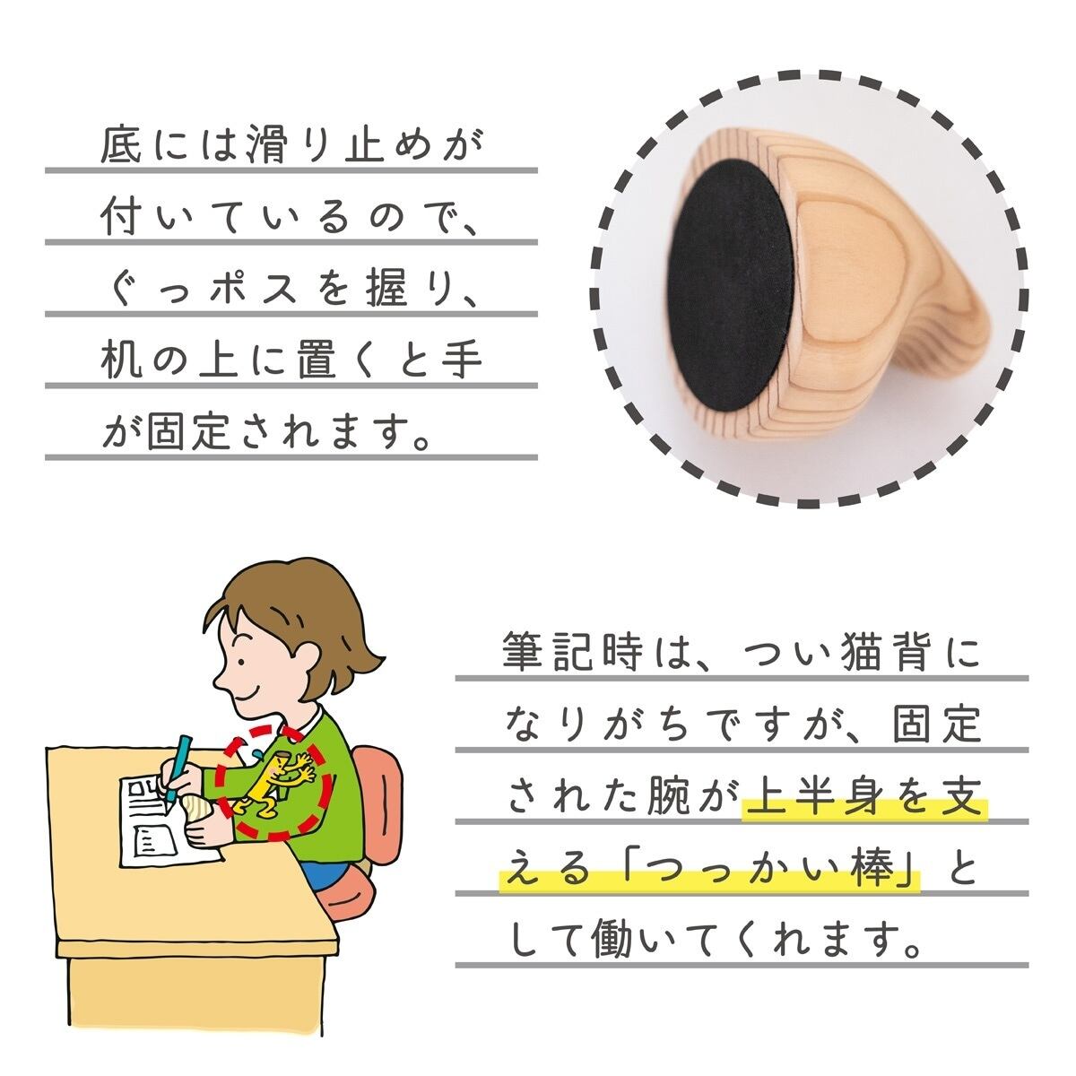 底には滑り止めが付いているので、ぐっポスを握り机の上に置くと手が固定されます。