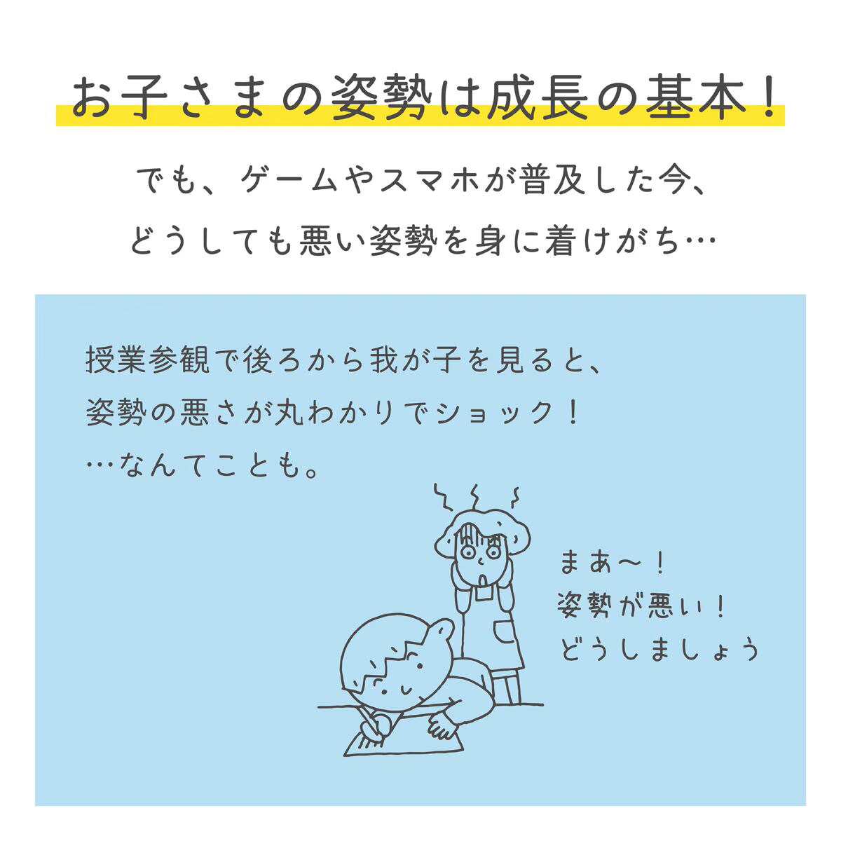 お子さまだけでなく、受験勉強をする中高生、テレワークやリモートワークでの姿勢の悪さや肩こりや頭痛、腰痛を改善したい大人の方にもご愛用いただいています。